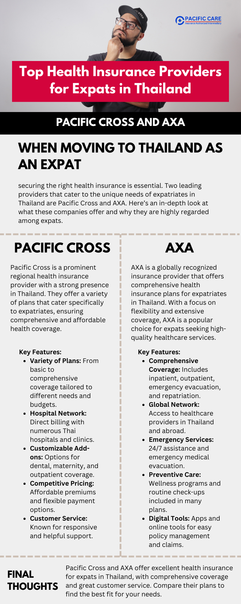 Both Pacific Cross and AXA are excellent choices for expats seeking health insurance in Thailand. They offer comprehensive coverage, extensive provider networks, and excellent customer service. By carefully evaluating your needs and comparing the offerings of these two providers, you can select a health insurance plan that provides the protection and peace of mind you need while living in Thailand.