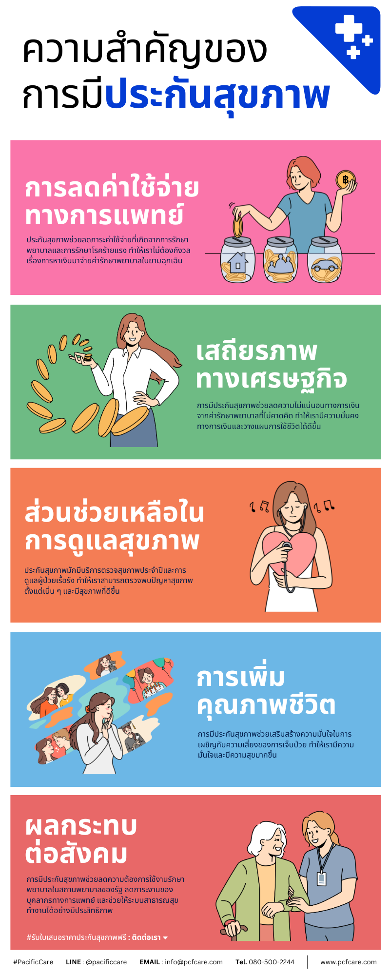 การมีประกันสุขภาพเป็นการลงทุนที่คุ้มค่า ช่วยให้เรามีความมั่นคงทางการเงิน เสริมสร้างคุณภาพชีวิต และช่วยให้ระบบสาธารณสุขของประเทศทำงานได้ดีขึ้น